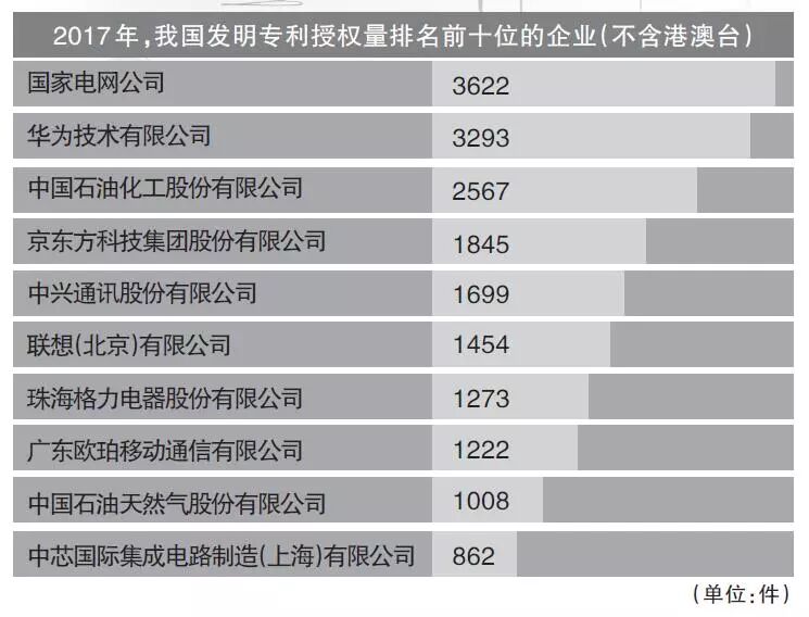 2017年,我国发明专利授权量排名前十位的企业(不含港澳台)依次为国家电网公司(3622件)、华为技术有限公司(3293件)、中国石油化工股份有限公司(2567件)、京东方科技集团股份有限公司(1845件)、中兴通讯股份有限公司(1699件)、联想(北京)有限公司(1454件)、珠海格力电器股份有限公司(1273件)、广东欧珀移动通信有限公司(1222件)、中国石油天然气股份有限公司(1008件)、中芯国际集成电路制造(上海)有限公司(862件)。