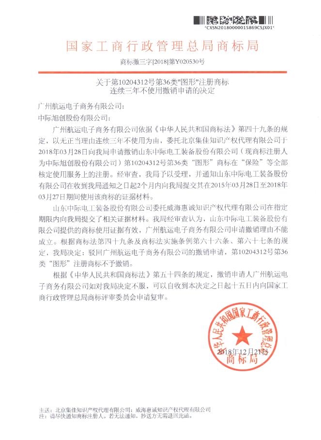 我所2018年4月受山东中际电工装备股份有限公司的委托,对商标“图形”因广州航运电子商务有限公司以无正当理由连续三年不使用为由向商标局提出商标撤三进行答辩,我所在接到委托后,迅速对现有证据进行审查,并筛选有效的使用证据,同时搜集遗漏的使用证据,相互印证,相互关联,形成有效的证据链条,在规定时限内,提交了商标“图形”在2015年3月28日至2018年3月27日期间内充分且有力的使用证据,驳回了中际电工装备股份有限公司的撤销申请。成功维护了委托人对商标的专有权。